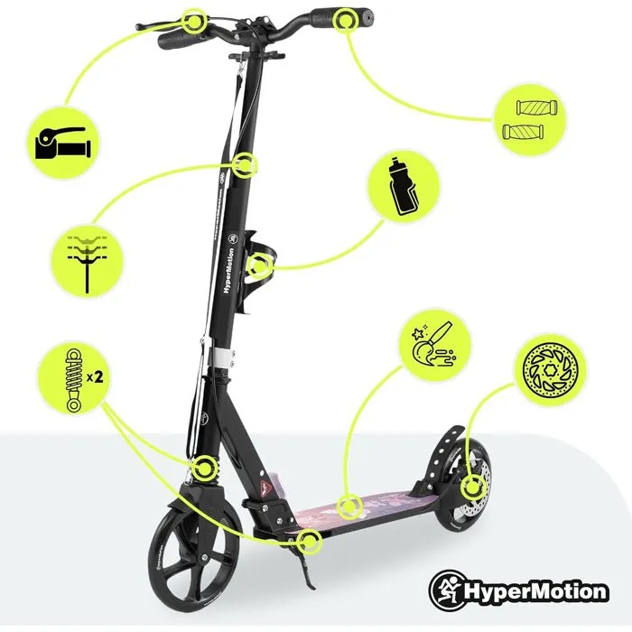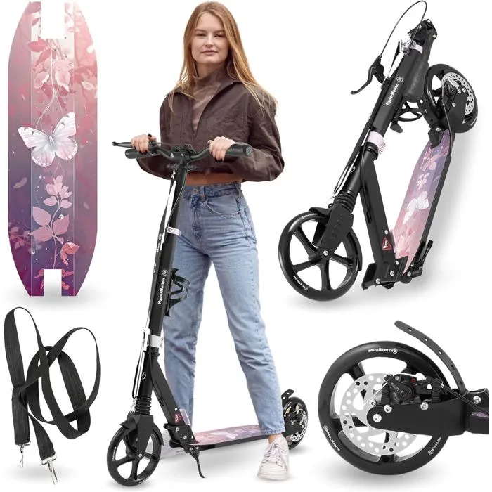 Trottinette ado adulte jusqu’à 100kg- 2 amortisseurs- HyperMotion Skyline Fleurs- Pliable- 2 Freins- Aluminium- ABEC-7. Faites plaisir à vos activités de plein air et profitez du mouvement. La trottinette HyperMotion Skyline Fleurs est une recette attrayante pour l’effort physique et en même temps un moyen de transport pratique. Son design unique attire efficacement l’attention et ajoute du caractère. Caractéristiques principales : – Trottinette fabriquée à partir de matériaux de haute qualité. – Aluminium, léger mais solide. – Grandes roues en caoutchouc. – Deck antidérapant, orné d’un motif de crâne. – Design moderne et original. – 2 freins (manuel et au pied). – Frein à disque manuel avec force de freinage réglable. – Poignées ergonomiques à haute adhérence avec fonction de pliage. – Transport facile grâce à la sangle de transport. – roulements de classe ABEC-7. – Double suspension. – Facile à plier et à démonter – il suffit d’utiliser un seul bouton. – Repose-pieds pliable. – Volant réglable en hauteur sur 3 positions. – Stabilisateur de directionavec amortisseur à ressort- Avec double boucle de serrage en aluminium. – Instructions de montage et clé Allen incluses. – Charge maximale : 100 kg. – Pour adultes, adolescents et enfants de plus de 6 ans. – Dimensions : 95 x 51 x 94/101/108 cm. – Dimensions de la trottinette pliée : 87 x 13 x 27 cm.- Dimensions de l’emballage : 85 x 13,5 x 34 cm. – Dimensions du plateau : 45 x 13,5 cm.- Diamètre des roues: 20 cm. – Longueur du guidon: 51 cm. Longueur de la poignée (poignée) : 12 cm. – Diamètre du porte-gobelet : 7 cm. – Longueur de la sangle de transport: 57 cm. – Poids : 5,7 kg. – Dureté des roues: 86matériaux: Cadre: 100% aluminium, roues: PU (caoutchouc)- Poignées: TPR
