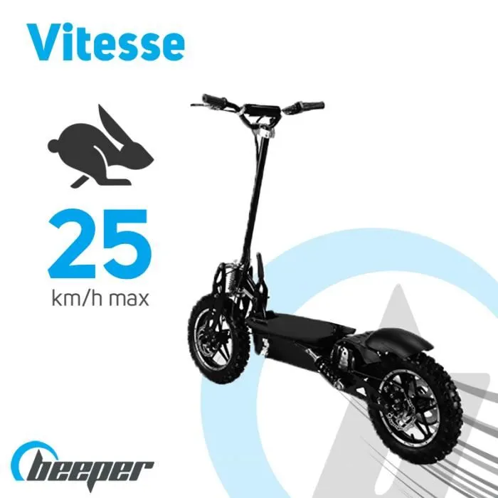 La trottinette Beeper CROSS est dotée d’un moteur brush de 1700W max (1000W nominal) et d’une batterie Plomb 36V.