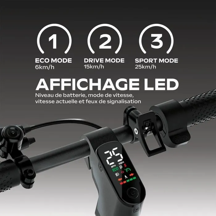L’écran intégré au guidon de la EZWAY EX100 affiche toutes les informations essentielles : vitesse, niveau de batterie et mode de conduite (Eco, Drive ou Sport).