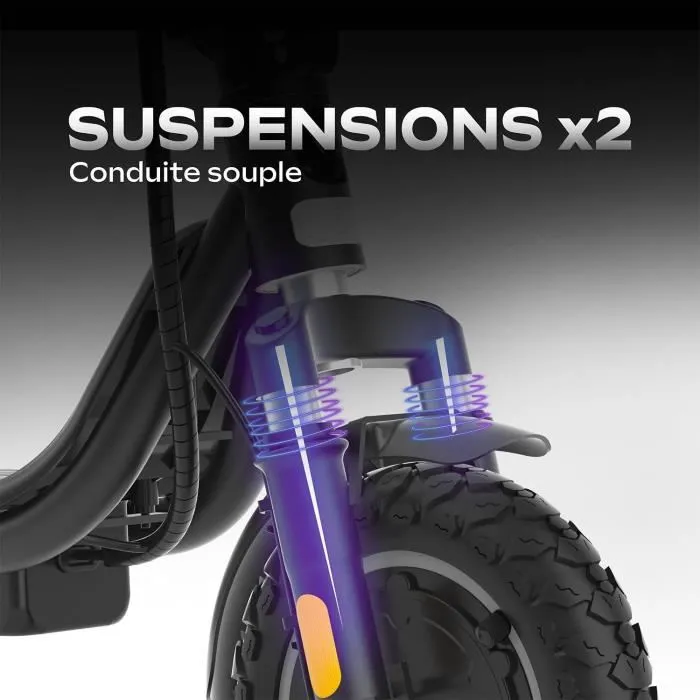 Équipée de roues de 10 pouces, la EZWAY EX100 offre une conduite stable et agréable, même sur des routes irrégulières. Son confort est renforcé par sa suspension avant qui absorbe les chocs et facilite vos trajets quotidiens.