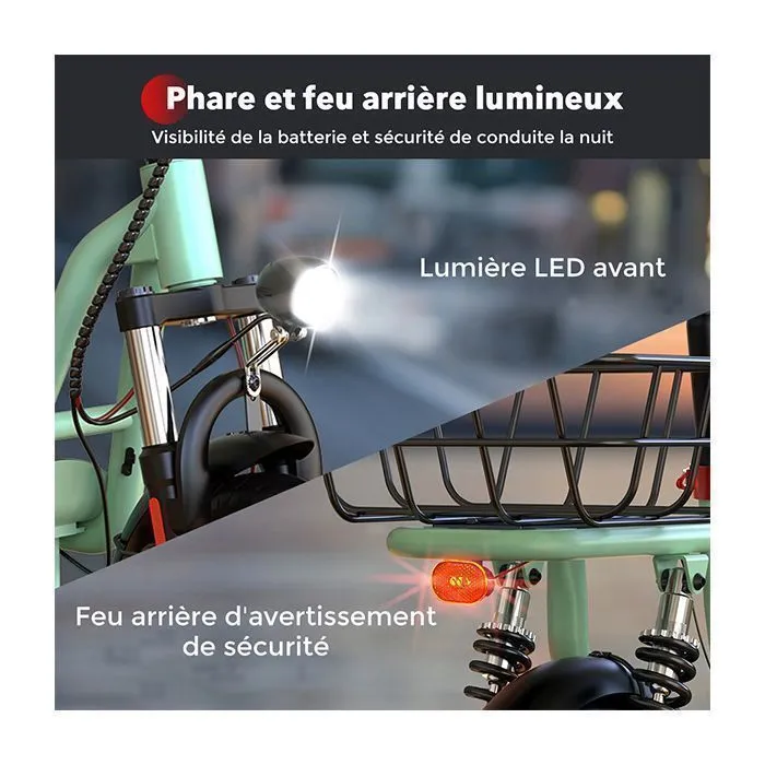 Puissance et Robustesse : Moteur 500W (traction avant), pneus gonflables 12 pouces, supportant jusqu’à 120 kg !