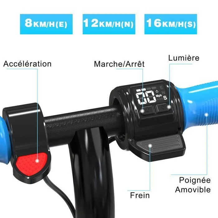 Le E6 est équipé d’un écran simple qui permet à votre enfant de vérifier l’état de la trottinette (puissance, vitesse, mode) pendant son utilisation. L’enfant peut également régler les lumières sur le côté de la trottinette à l’aide de simples boutons.