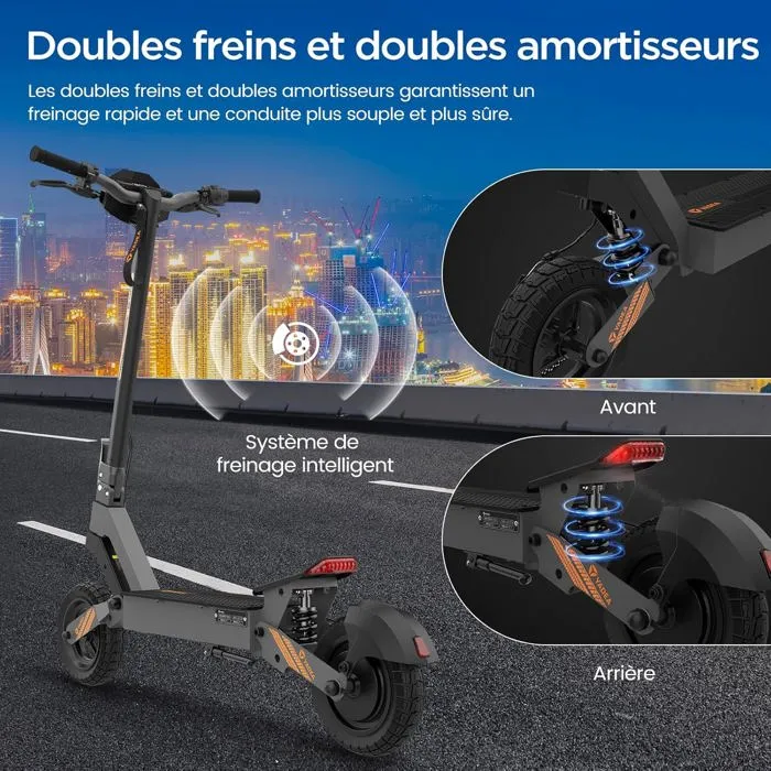 Conçue pour les riders exigeants, la Yadea G10 allie puissance et endurance. Son moteur de 800W permet des accélérations rapides et une vitesse de pointe de 52 km/h, tandis que sa batterie offre une autonomie extensible jusqu’à 50 km. Le système de freinage double disque et E-ABS garantit un arrêt précis et sécurisé dans toutes les conditions. Ses pneus 10″ tout-terrain et sa suspension complète assurent une conduite confortable même sur les routes accidentées. Compacte et pliable, elle se transporte et se range facilement. Parfaite pour les navetteurs urbains, les étudiants ou les amateurs de sensations fortes, la G10 est built pour repousser les limites.